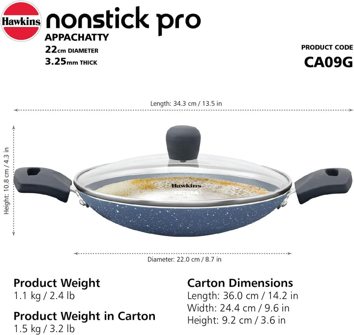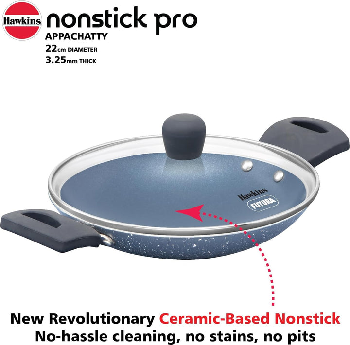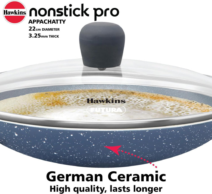 HAWKINS Nonstick Pro 0.9 Litre Appachatty Mini Kadhai Appachatti Appachetty Appam Pot Maker Deep Fry Pan with Glass Lid Granite Kadai