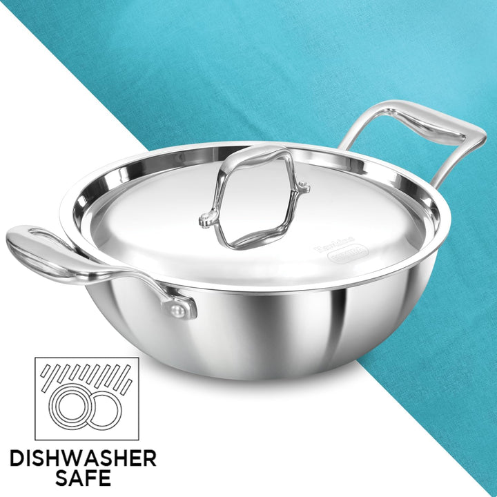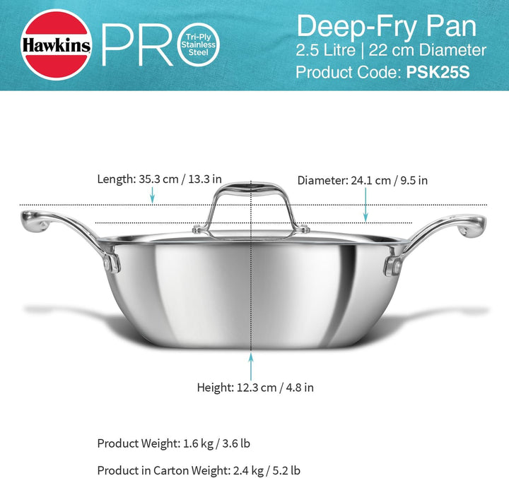 Hawkins Pro 2.5 Litre Deep-Fry Pan, Triply Stainless Steel Kadhai with Stainless Steel Handles and Lid, Silver