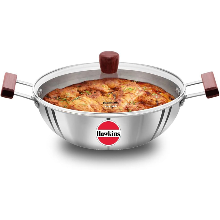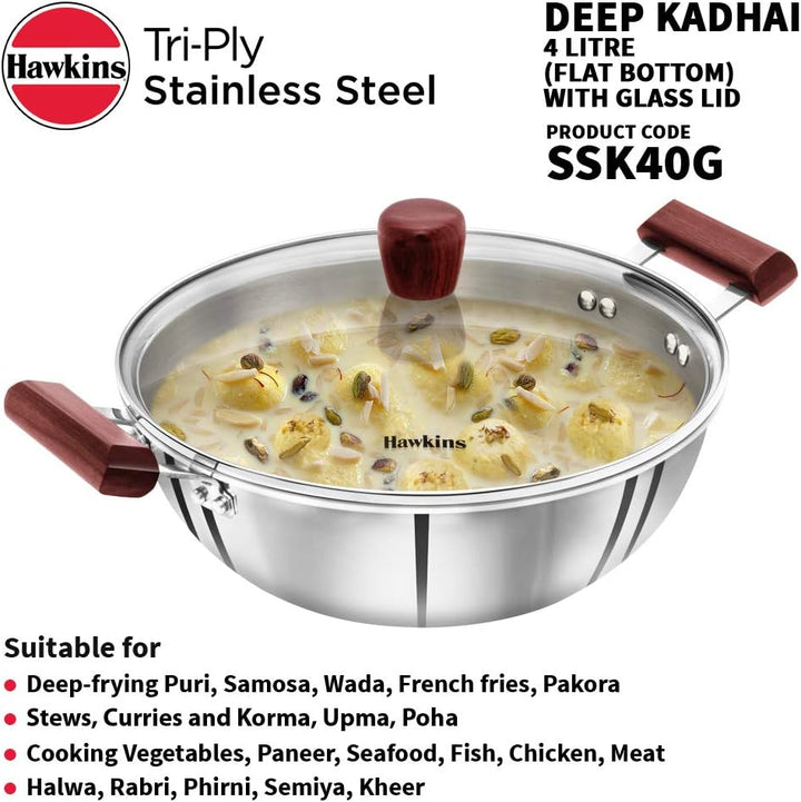 Hawkins Tri-Ply Stainless Steel Induction Compatible Deep Kadhai (Deep-Fry Pan) with Glass Lid, Capacity 4 / 5 Litre, Diameter 28 cm, Thickness 3 mm, Silver