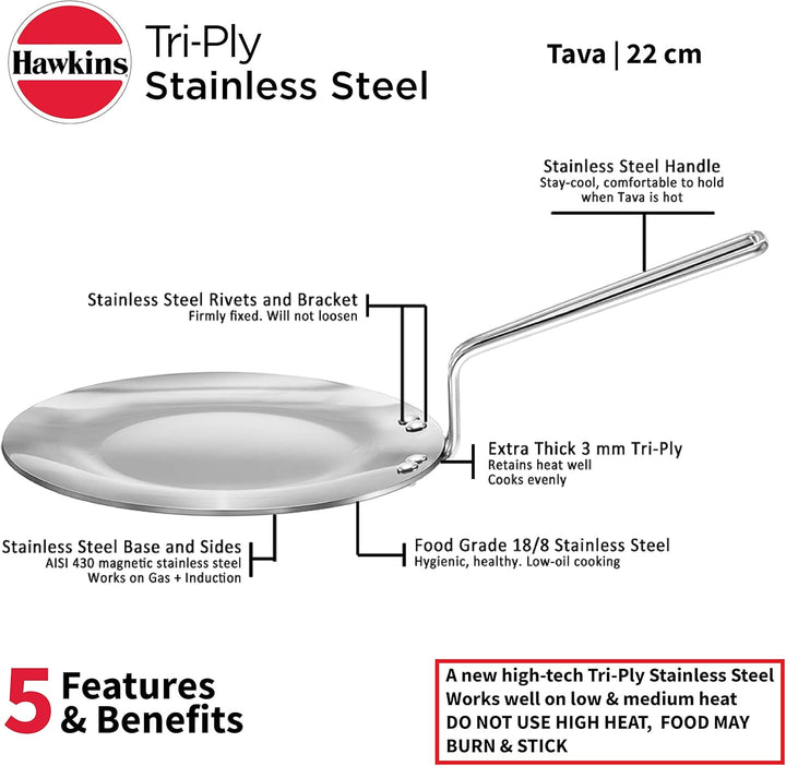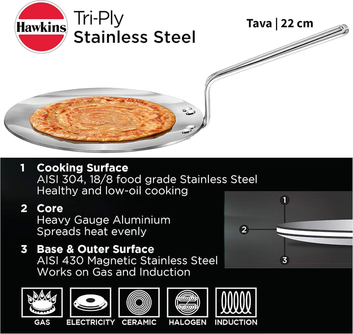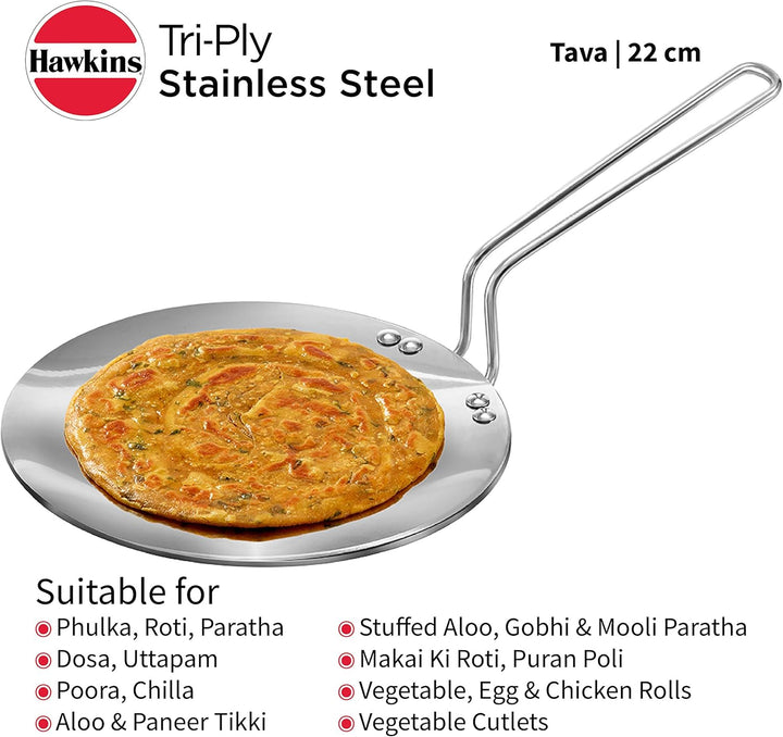 Hawkins Tri-Ply Stainless Steel Induction Compatible Tava, Diameter 22 , 26 cm Thickness 3.5 mm Silver