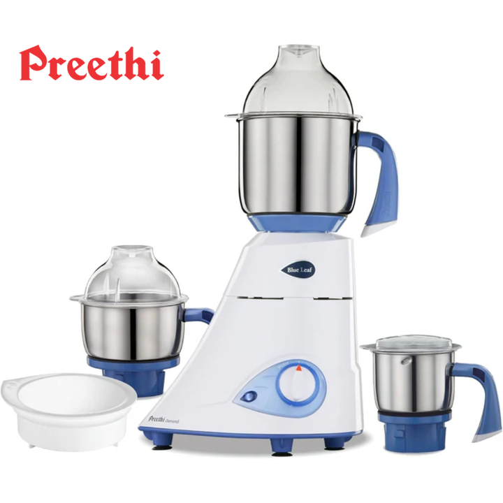 Preethi Blue Leaf Diamond 750-Watt Food Mixer, 3-Piece, Super Extractor & Air-Tight Storage | Heavy-Duty FBT Motor for Dry & Wet Grinding (Blue & White)| International Plug